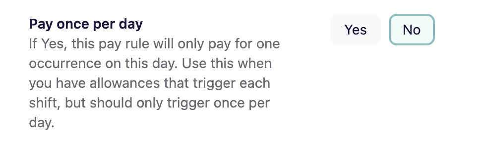 If the team member works multiple shifts in a day, use the Advanced Setting Pay Once Per Day to limit the payment to once per day.