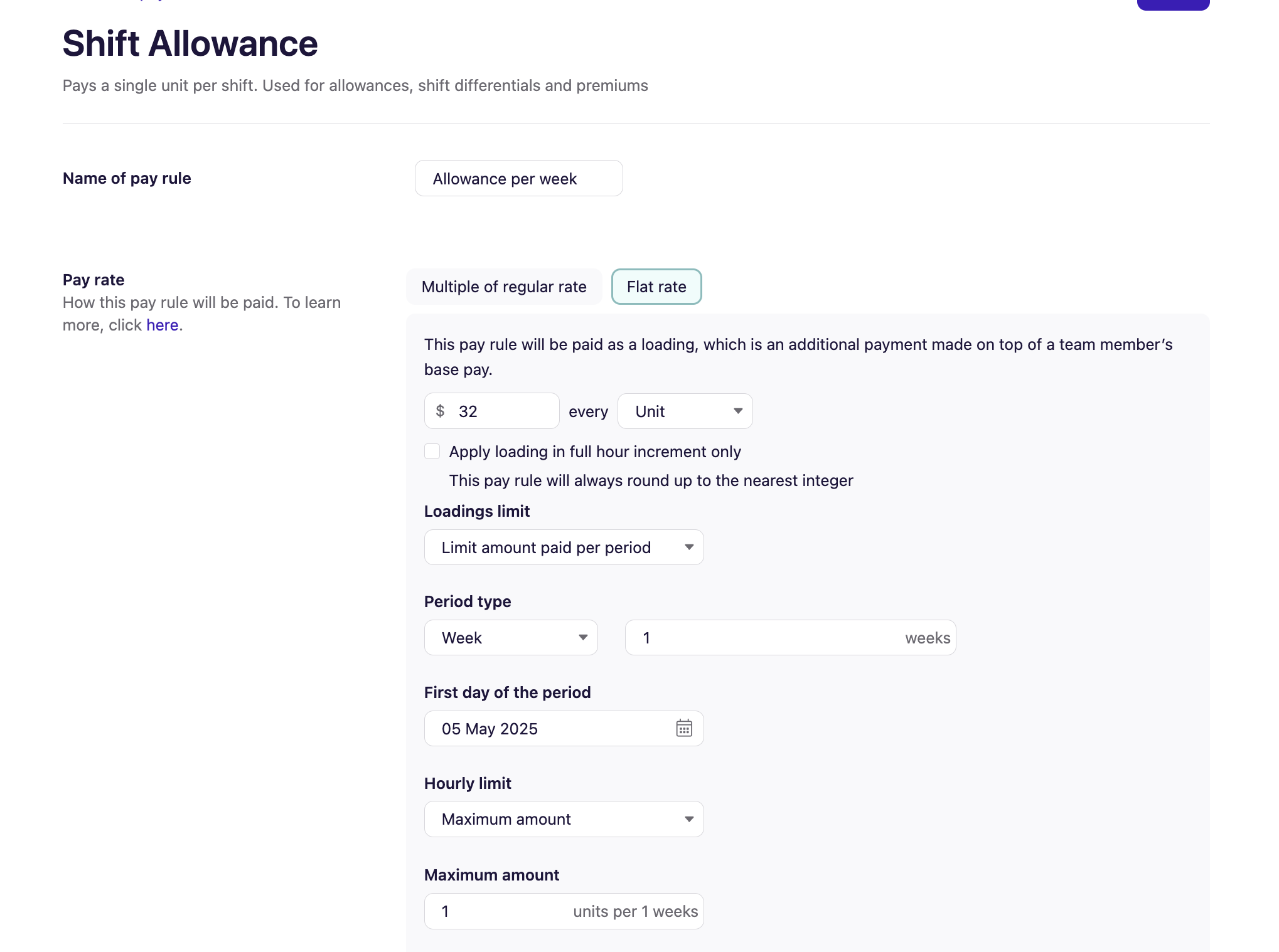 In the above example, this team member will be paid a $32 allowance on their first work day of the week. Because it is limited, it will only pay once per week. This period can be configured to meet your businesses requirements.