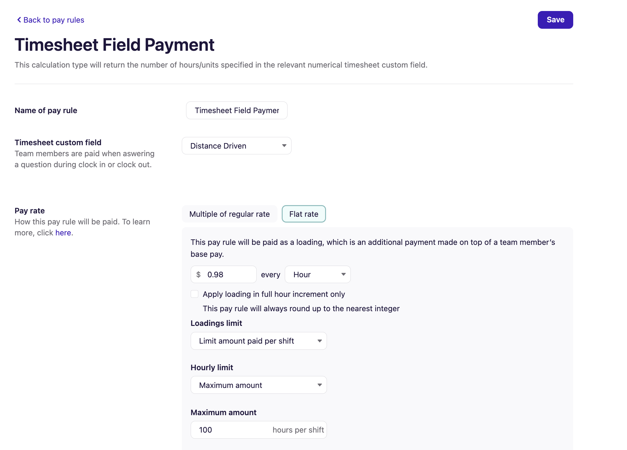 In this example, this will pay the user .98c per unit of distance driven (entered in the timesheet), up to a maximum of 100 units. If you do not want an upper limit, set the loading limit to No Limit.