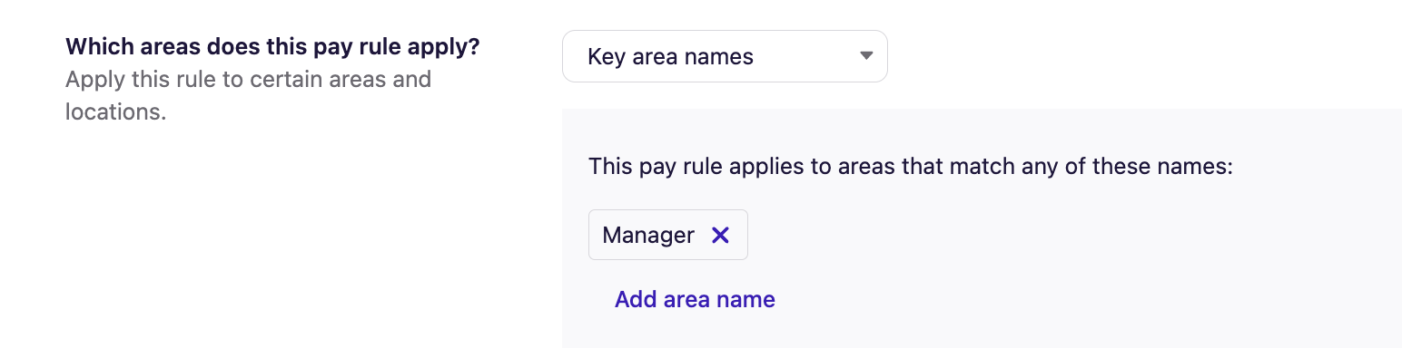 To configure this, use the Shift Allowance similar to example 1. Below this setup is a section on 'Which areas does this pay rule apply'.