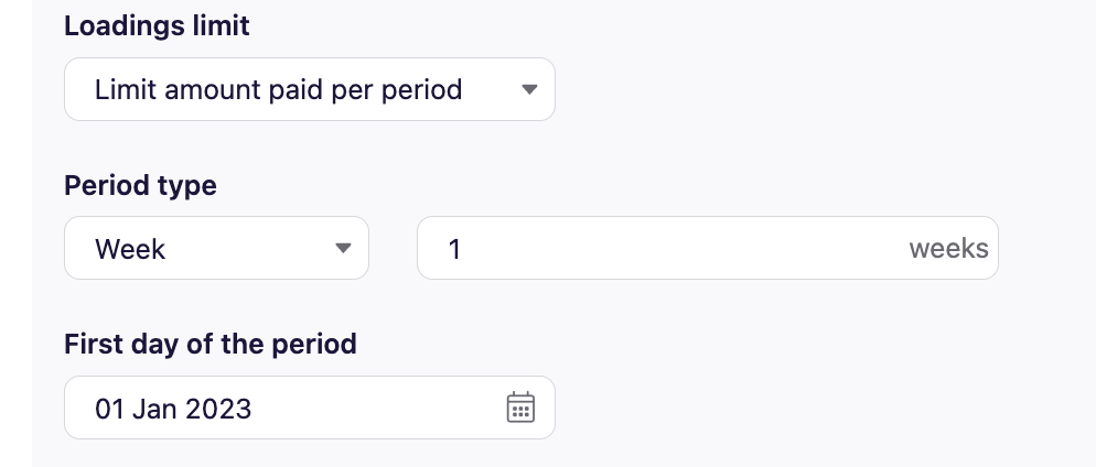 Determines what sort of limits are applied. No limit will not impose a limit. Limit amount paid per shift will cap the amount paid per timesheet, while Limit amount paid per period restricts the amount over a defined period of time, for example a week. Note for this to work correctly, ensure the first day of the period is before the timesheets you are trying to approve.