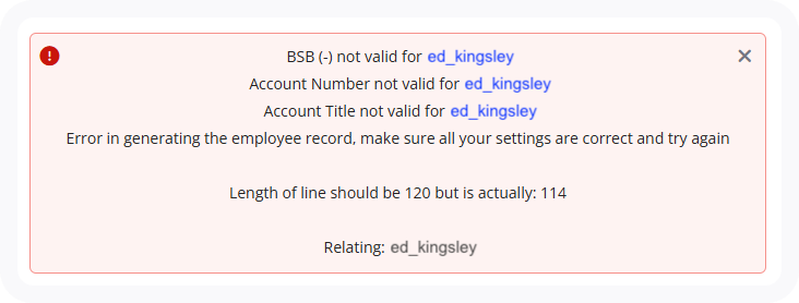 Sometimes, when you try to submit an STP, an error message may appear that is associated with an employee stating: "Length of line should be 120 but is actually: 114" and you cannot submit the STP. This error message occurs when an affected employee's bank information has not synced to Deputy Payroll.