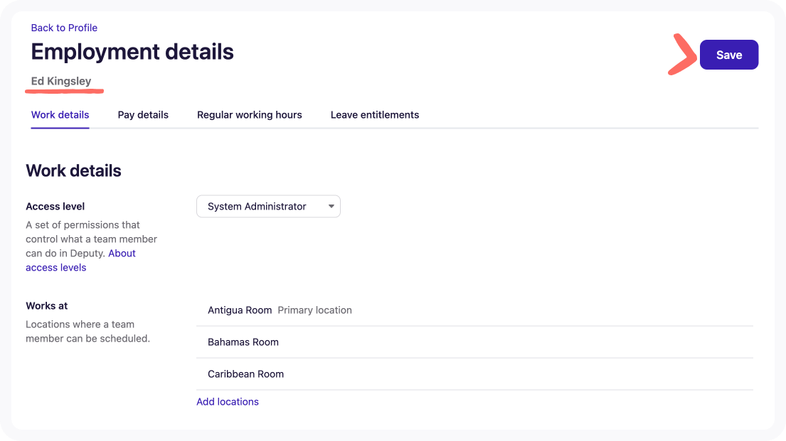 Note: In the example, the affected employee is Ed Kingsley. - Click the Save button.