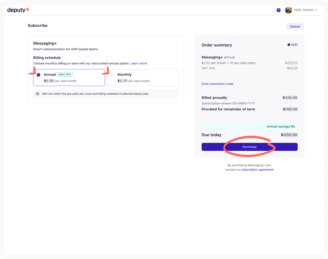 If you're on an Annual base plan, you'll have the option to choose either an Annual or Monthly billing schedule for your Deputy Messaging+ subscription. Read more about our annual billing options and annual pricing for Deputy Messaging+.