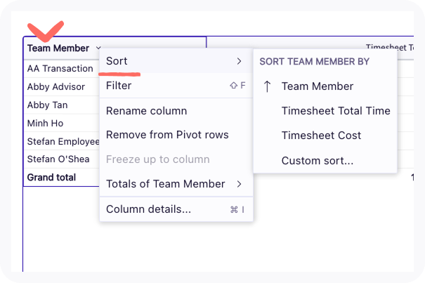 To sort the Team Member field by different criteria, click the column name, then select Sort to see the available options.