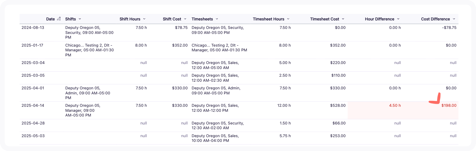 A table displaying the selected team member's shift details and timesheet details along with the associated cost difference based on the criteria selected using the filters above.