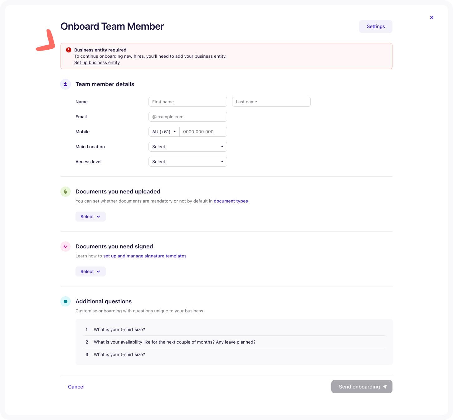 System Administrators will see the warning banner below on the Onboard Team Member page until they add their ABN, and the Send onboarding button will be frozen.