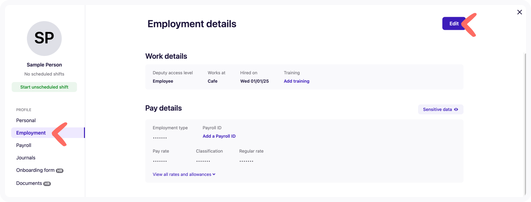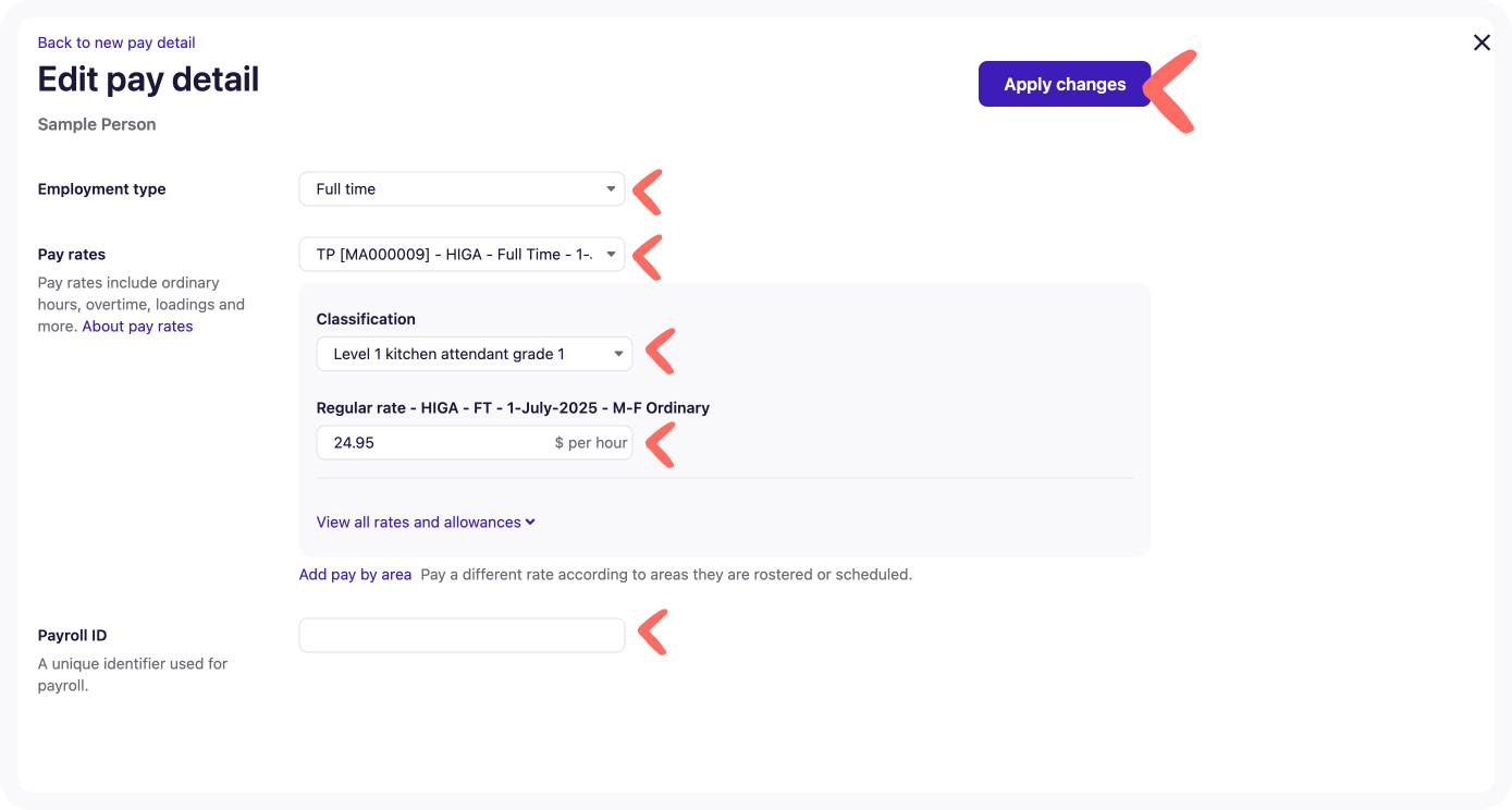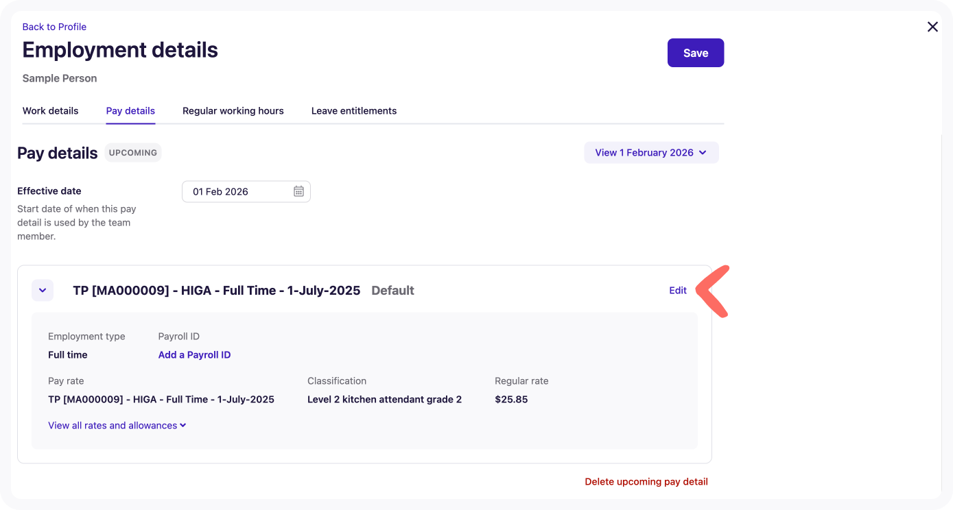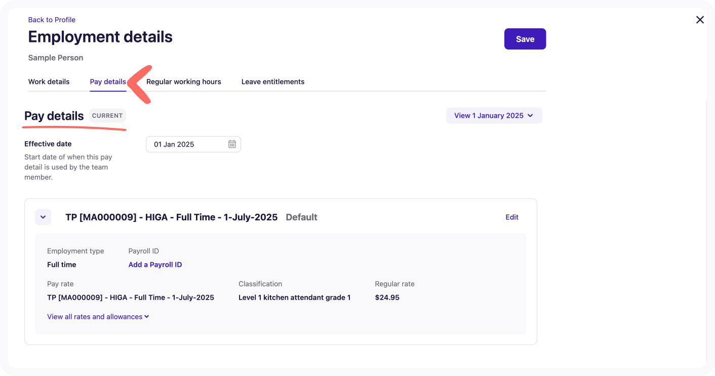 Navigate to Pay Details in the team member’s Employment profile.