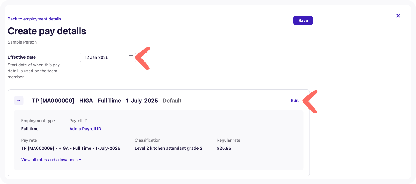In Deputy, every team member has a pay rate tied to a specific start date. When you need to change what someone earns, you do not have to wait until the day of the increase to update their profile. Instead, you can add a new pay record with a future start date.