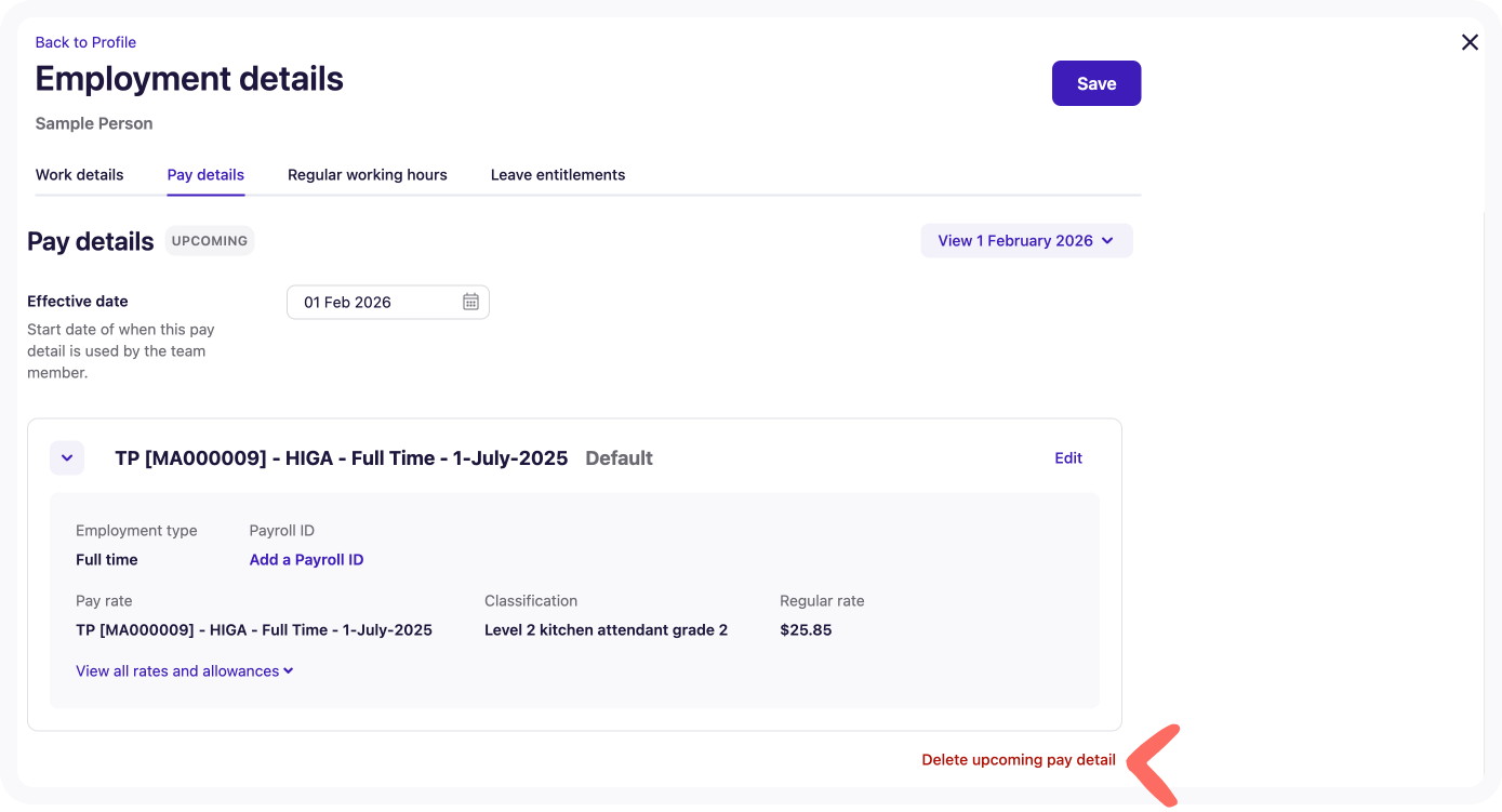 Click Delete upcoming pay detail.