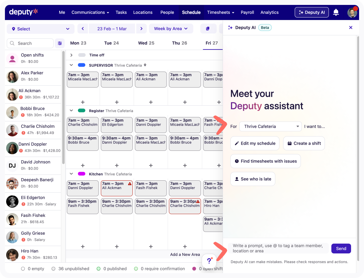 You can use Deputy AI for everyday tasks related to Scheduling and Timesheets.