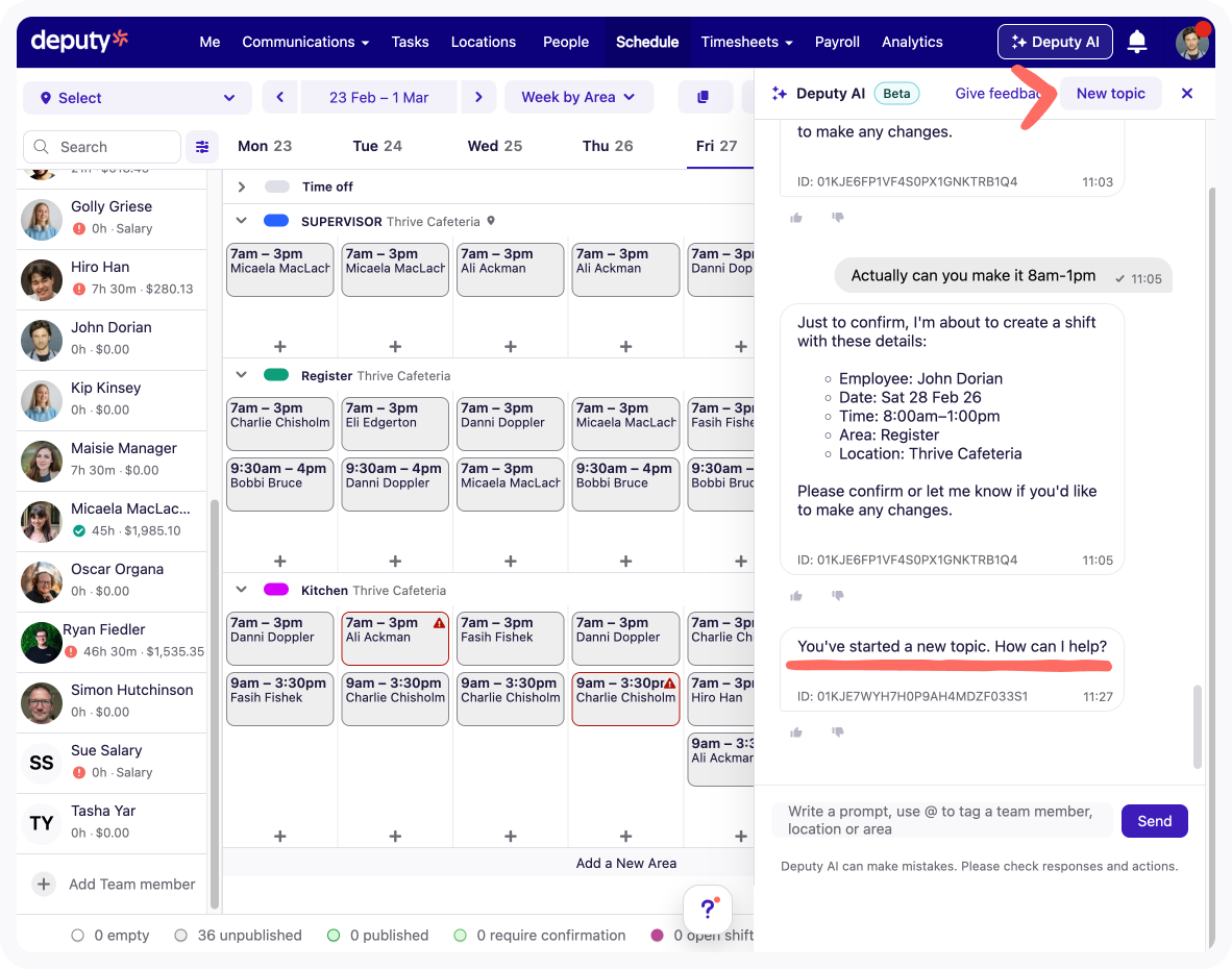 Note: If you have multiple unrelated requests, click New Topic to start from scratch. This keeps Deputy AI focused on the topic and prevents it from pulling in context from earlier conversations.