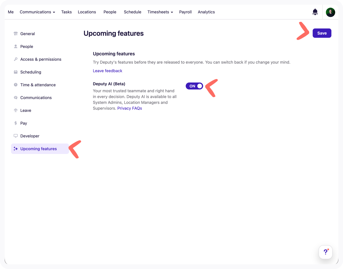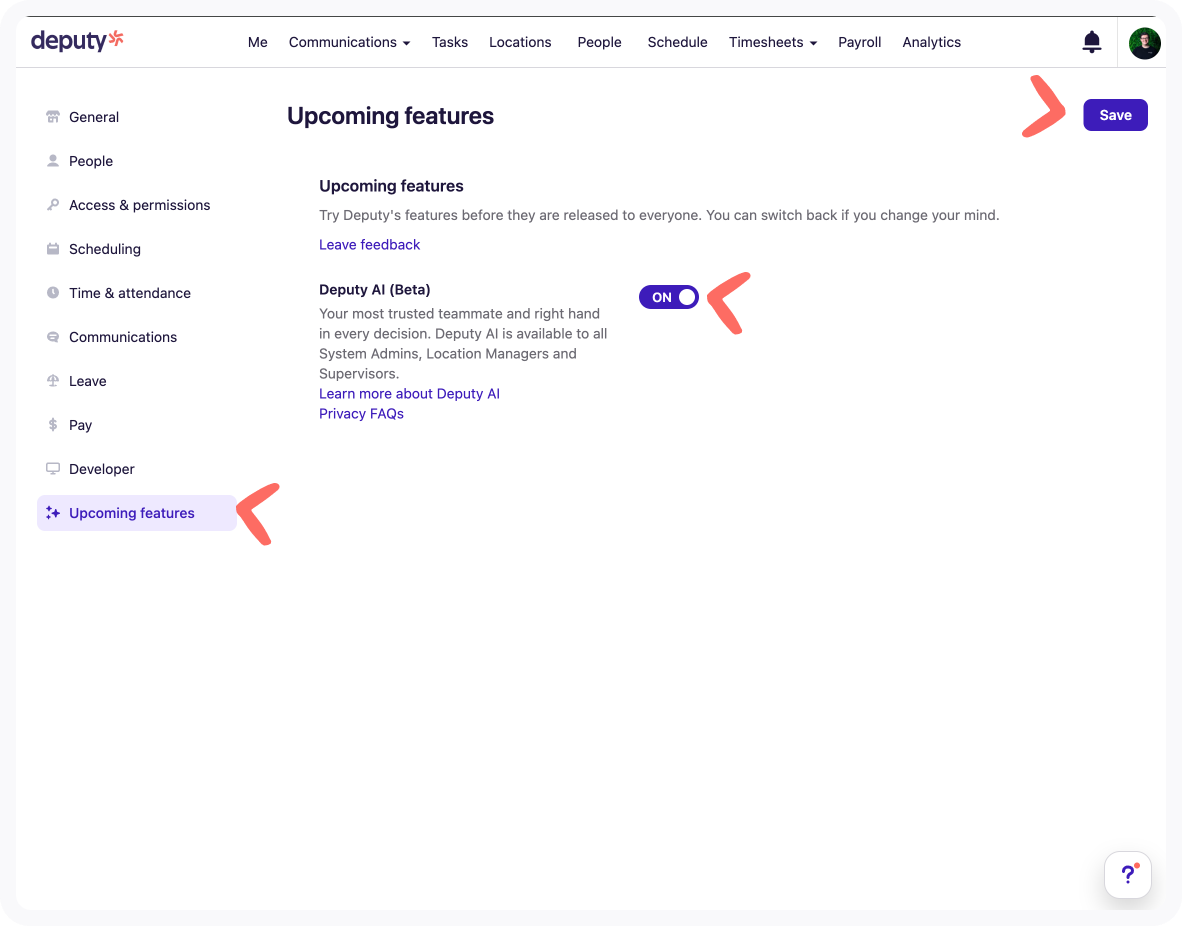 In the left-hand menu, click Upcoming features, find the Deputy AI toggle, switch it to ON , and hit Save.