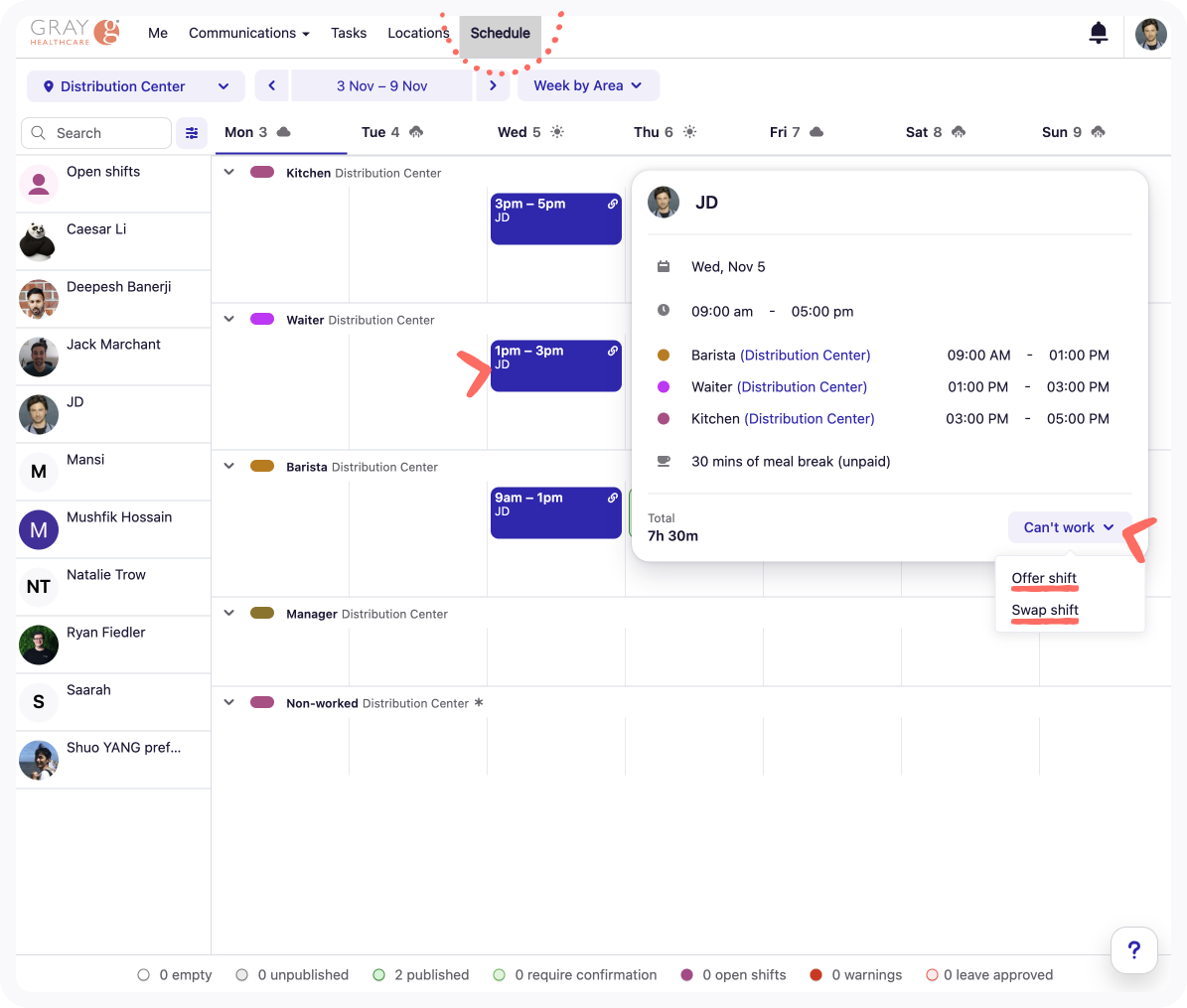 If you’re offering your shift instead of swapping it, you’ll be able to select team members from a list of people who are eligible and potentially available to work your shift.