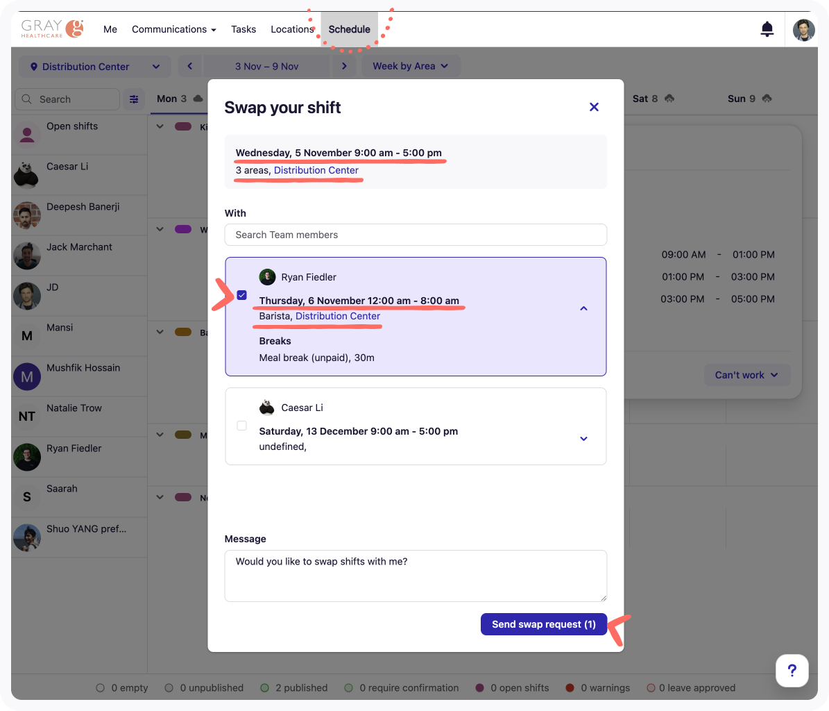 If you select Swap shift, you’ll see a list of other team members and their shifts. Choose the shift or shifts you’d be happy to swap for, add a message for your teammate(s) if needed, and click Send swap request (_).