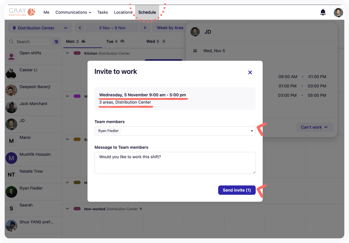 Enter an optional text message to let people know why you want to offer the shift then select the team member(s) you wish to offer the shift to, then click Invite _ to work this shift.