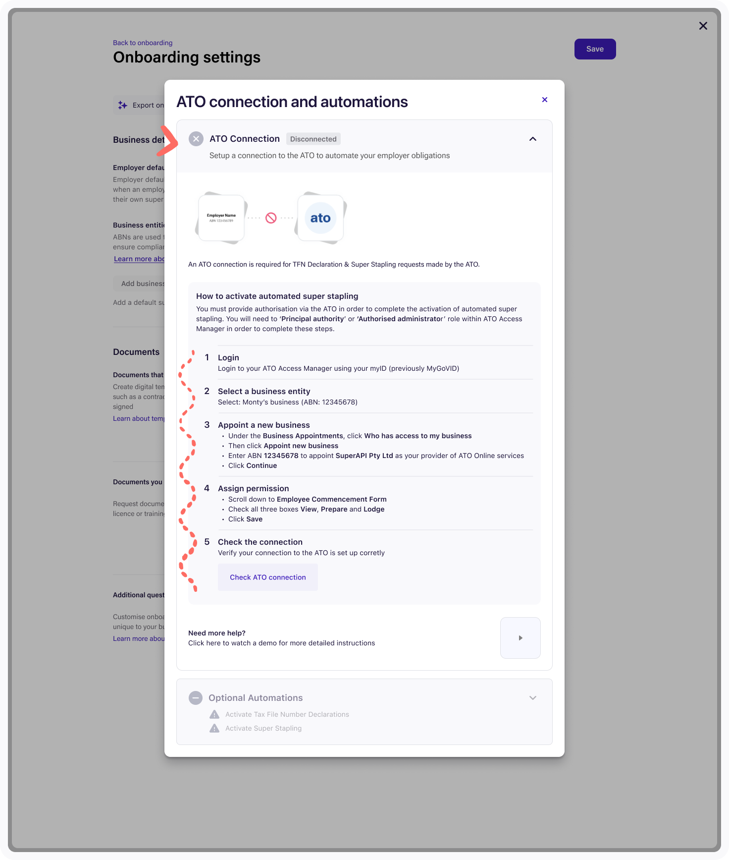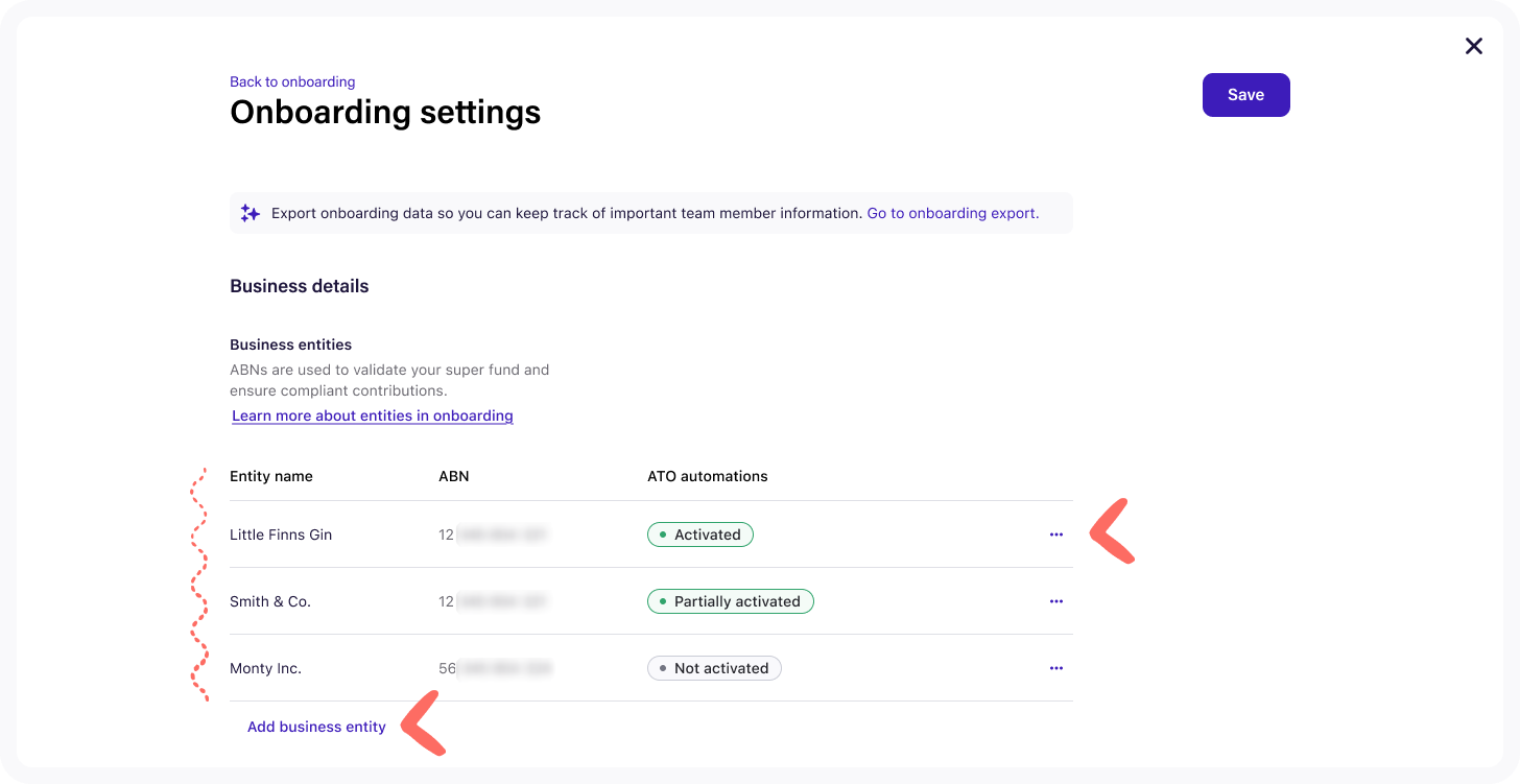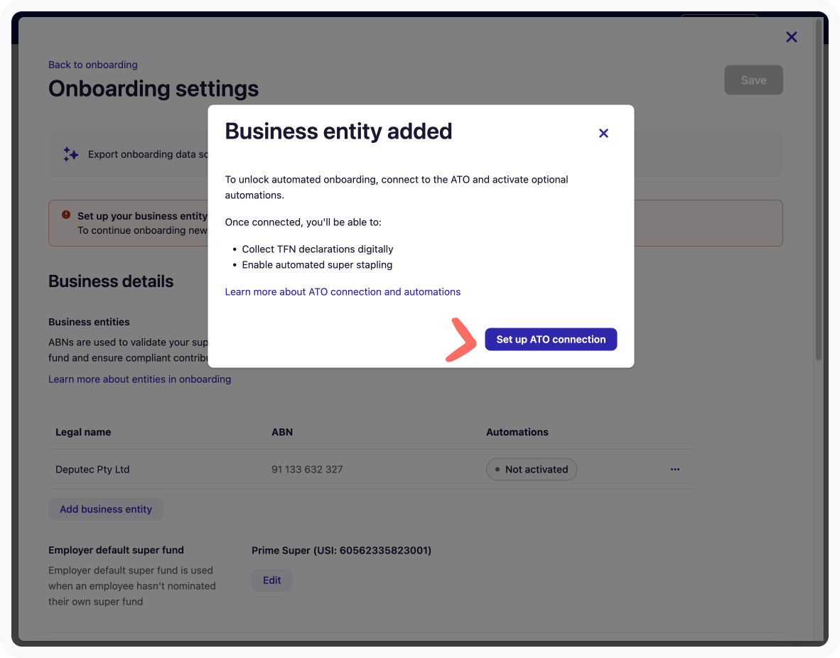 10. When a business entity has been added, it will be visible within your onboarding settings with an ATO Automations Status: