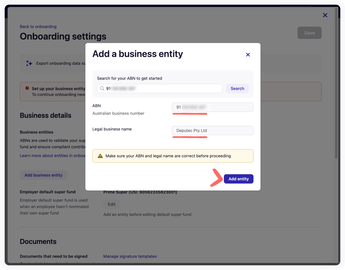 6. To avoid any potential issues or delays with onboarding your new hires, confirm your ABN and that it has pulled through your legal business name before clicking Add entity.