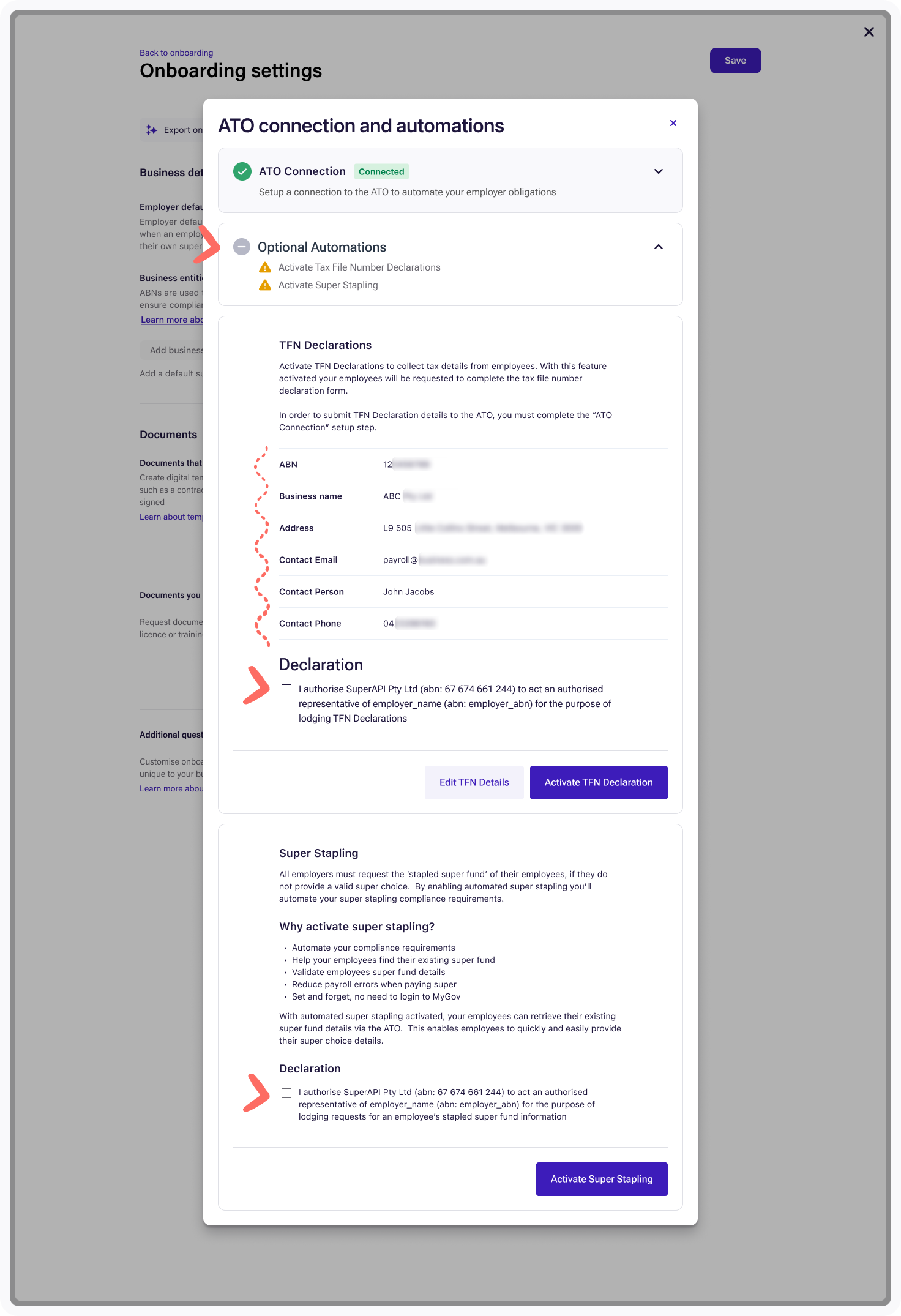 - To turn this on, check that your business details are correct, tick to confirm the declaration, then click Activate Super Stapling.
