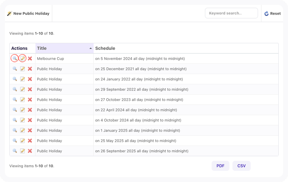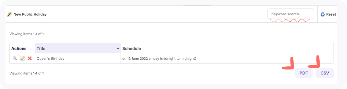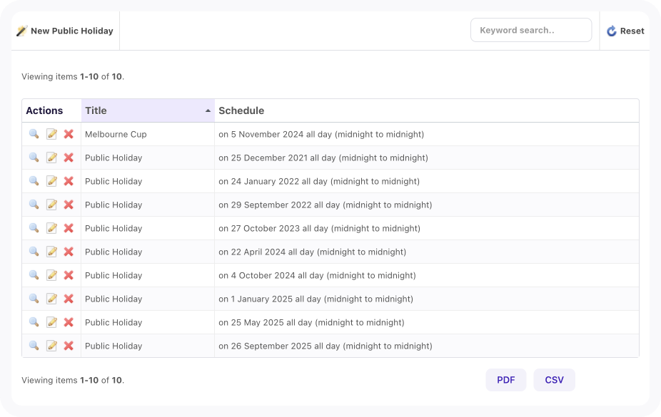 For reporting purposes, you have the option of exporting Public Holidays to PDF or CSV (bottom right of screen). By default, all Public Holidays will export but you can filter to more specific holidays by adding a keyword search.