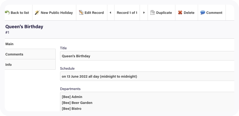 - View the holiday details (select Comments or Info from the menu on the left to view comments more details about who created or modified the holiday)