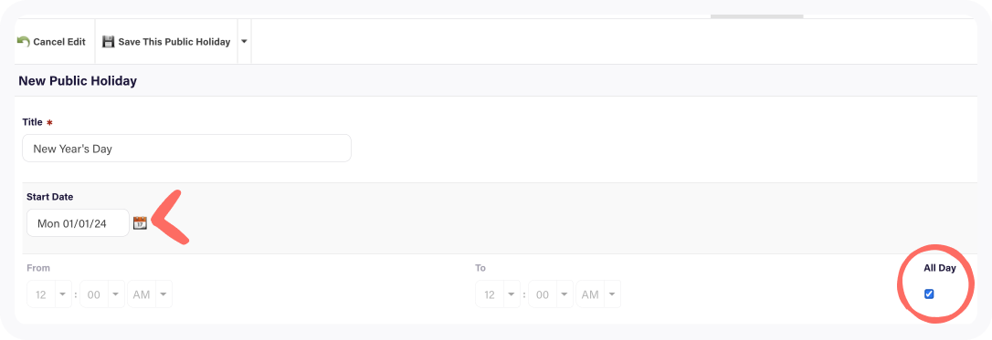 Select the date the public holiday falls on and select the start and end time or tick the All Day box.