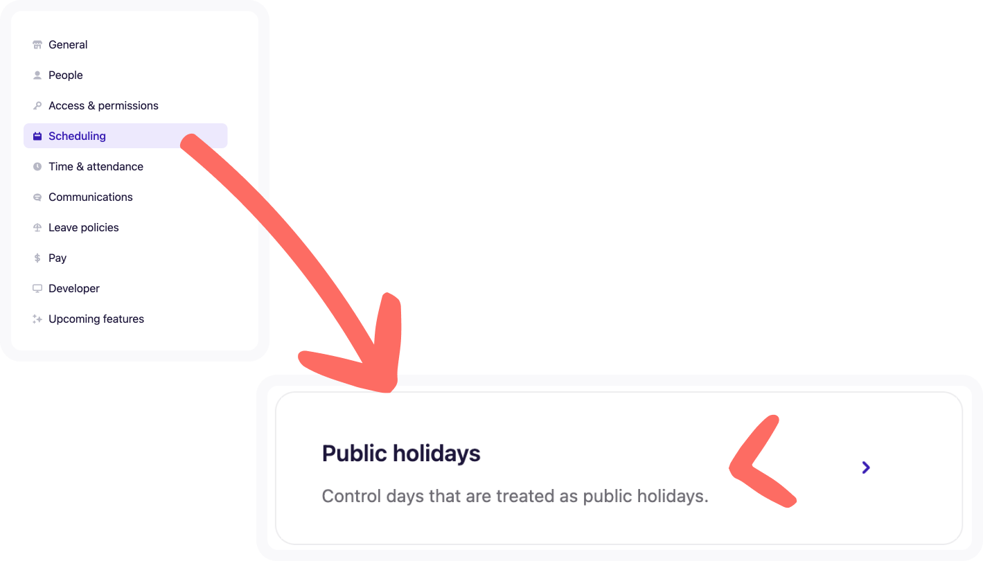 2. Under the Scheduling tab in business settings, select Public holidays: