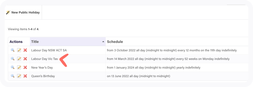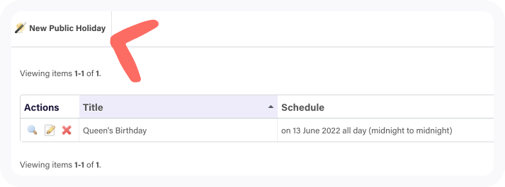 Edit (pencil and pad icon) allows you to immediately edit a Public Holiday.
