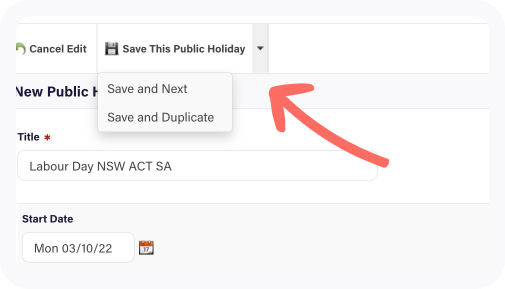 When you’re finished creating a holiday, click Save This Public Holiday at the top of the page or get started adding another holiday by choosing Save and Next to start creating a new holiday or Save and Duplicate to start creating a new holidays based on the parameters you have already entered for the current holiday.