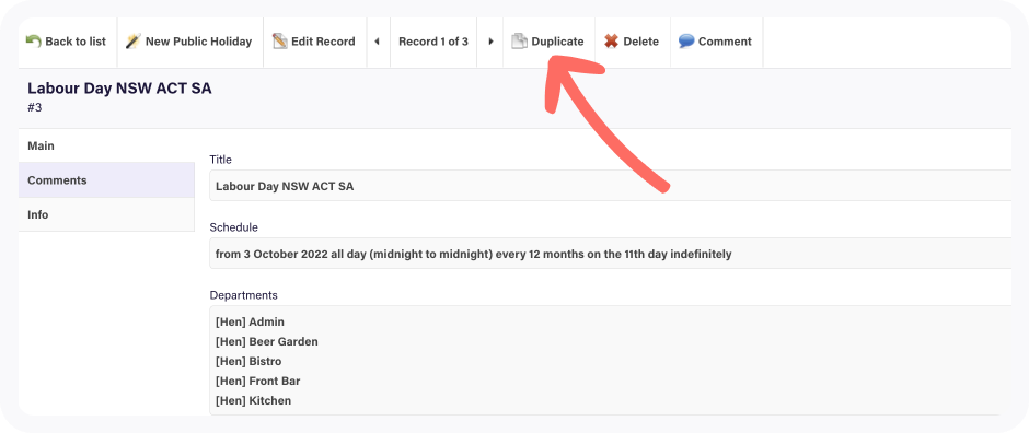 You can create public holidays for the future that may be identical in all other aspects but occur on a different day each year. By duplicating the public holiday, it’ll save time on editing a few details such as the date and title and retain the locations and other information within the public holiday.