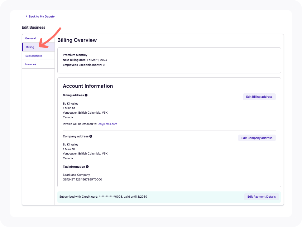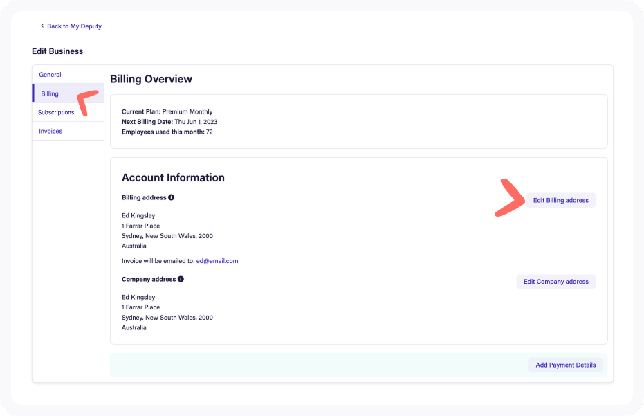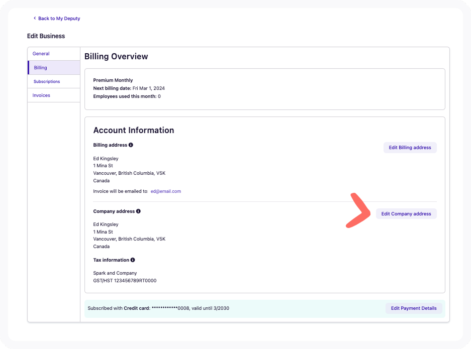 To update your company information, access the Billing tab in Deputy and click on Edit Company address.