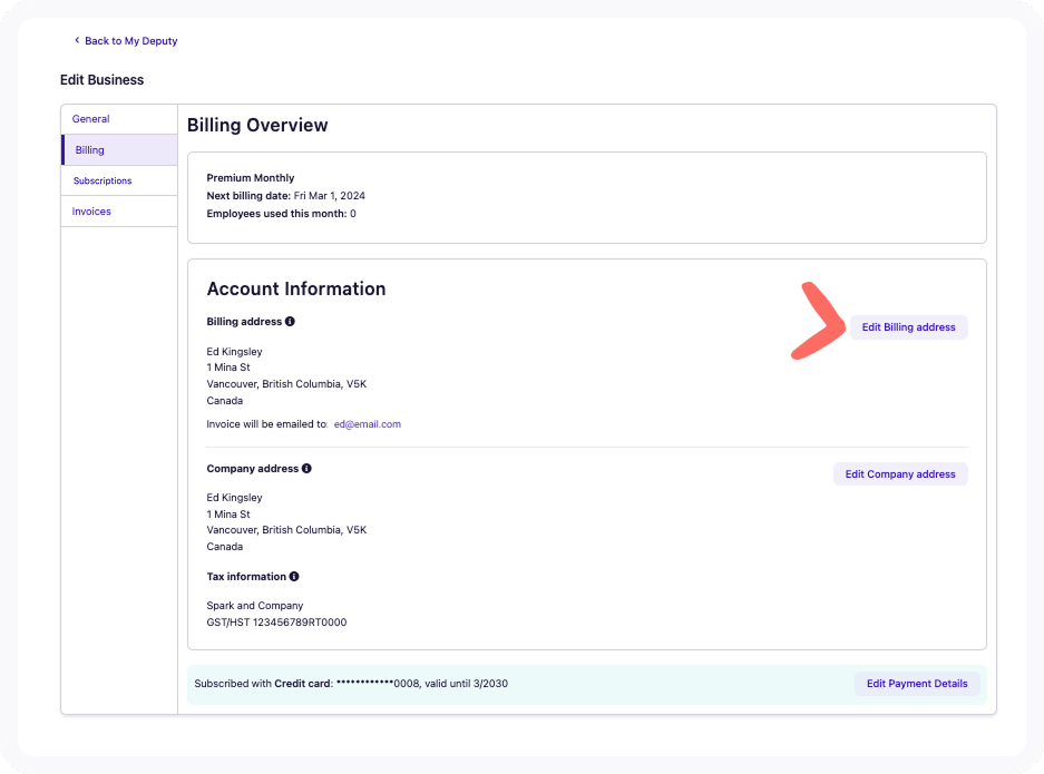 To update your billing address, access the Billing tab in Deputy and click on Edit Billing address.
