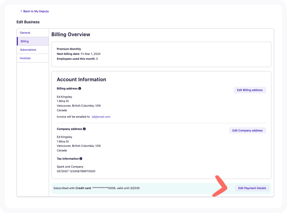 As well as billing details, Deputy also asks that you enter an accurate company legal business name, company address and tax number (where relevant) to ensure we calculate the applicable taxes.
