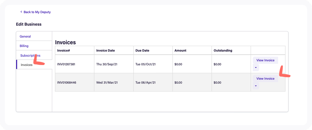 System Administrators in Deputy can access their existing billing and payment details by logging into once.deputy.com, clicking Settings for the relevant business.