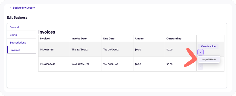 3. Click the Invoices tab and click View Invoice drop-down box and click Usage/SMS CSV.