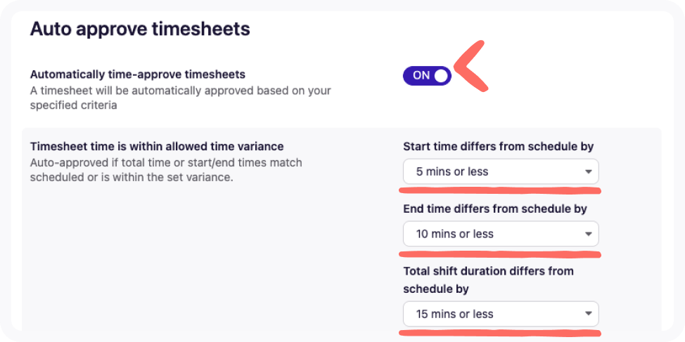 - Auto time-approve timesheet option is turned on for when the variance is up to 10mins for start time, end time and total shift time