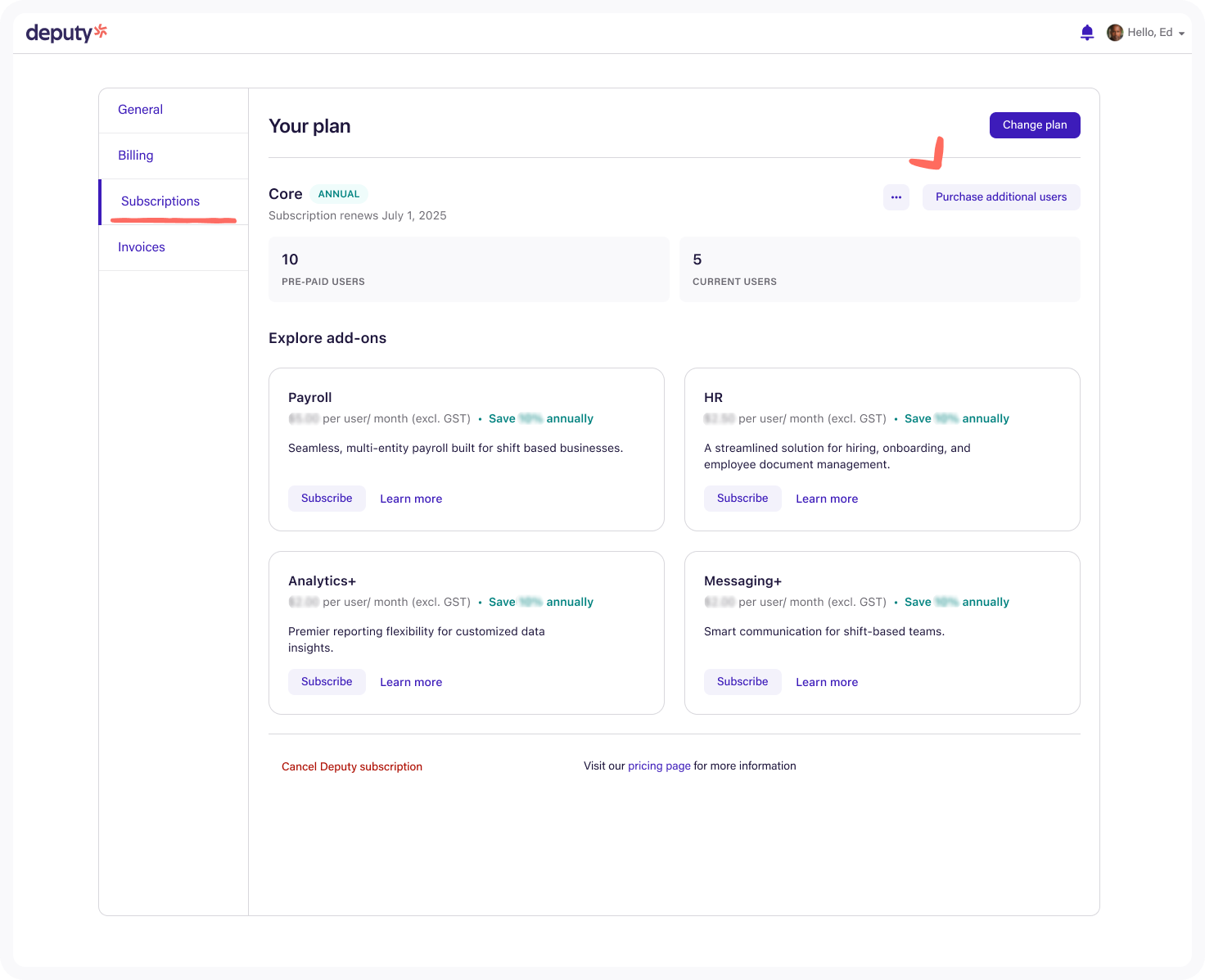 Tip: Missing the Subscriptions tab? Please email csm@deputy.com to manage your plan instead.